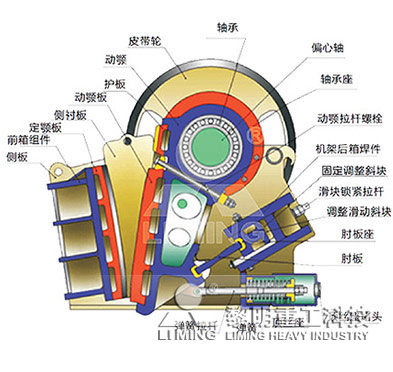 歐版顎式破碎機主要由機架部分,偏心軸轉動部分,破碎腔工作部分,保險裝置,排料口調整裝置等組成。